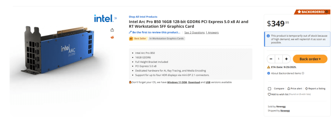Intel's Battlemage-based Arc Pro B50 workstation graphics card has quickly climbed to the top of Newegg's "Best Selling Workstation GPUs" list since its launch in early September. With a price tag of $349 and boasting 16 GB of video memory, it has garnered significant attention from budget-conscious buyers and is currently sold out at some retailers.