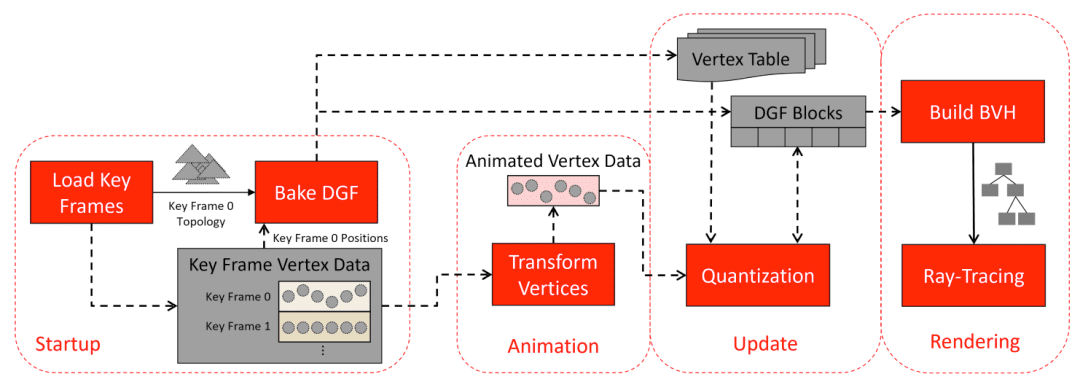 レイトレーシング以外にも、DGFはアニメーションにも有利です。圧縮されたジオメトリフォーマットにより、より多くのジオメトリデータをGPUのキャッシュに格納でき、メモリの読み取りと書き込みの頻度を減少させます。現代のゲームやデジタルコンテンツ作成では、キーフレームのアップデートが高速化され、アニメーション再生がスムーズになり、レイテンシが短縮されます。特に大規模シーンや複雑なキャラクターアニメーションでは、DGFはGPUの負荷を大幅に軽減できます。