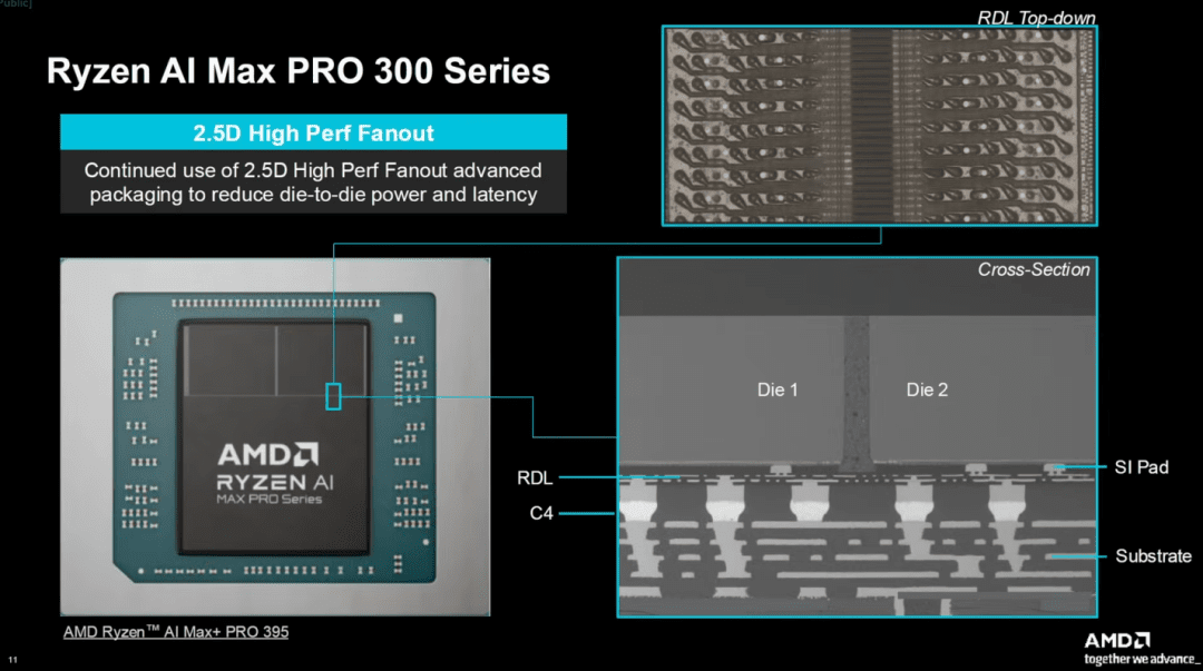 Strix Halo's methodology diverges from tradition. It utilizes TSMC's InFO-oS (Integrated Fan-Out on Substrate) along with Redistribution Layer (RDL) technologies to facilitate direct chip-to-chip communication through compact, dense parallel lines. At the packaging level, InFO-oS permits the addition of further wiring layers between the silicon and organic substrate, while RDL aids in signal redistribution into these wiring layers. This allows for direct interconnection between the CCD and SoC chip via expansive parallel ports, bypassing reliance on the SERDES module. Visual evidence of the "fan-out" structure can already be discerned in Strix Halo's chip photomicrographs: an organized arrangement of micro-pad areas supplanting the expansive SERDES circuits.